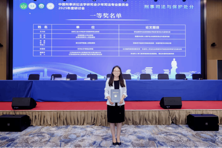 与此同时,在中国刑事诉讼法学会少年司法专业委员会2025年学术征文评选中,张丽霞老师的论文《从归因风险到发展支持:未成年人司法社会调查和评估的目标转型和功能协同》以鲜明的问题意识、创新性的理论分析及务实的制度建议,从众多投稿中脱颖而出,荣获征文一等奖。