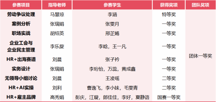 取得了劳动争议处理赛道特等奖以及案例分析、职场实战、企业工会与企业民主管理、HR+出海赛道和实务设计赛道6个赛道一等奖,其中京津冀蒙晋赛区独创的HR+雇主品牌赛道获得国赛一等奖。最终取得了团体一等奖,并晋级国赛的佳绩。