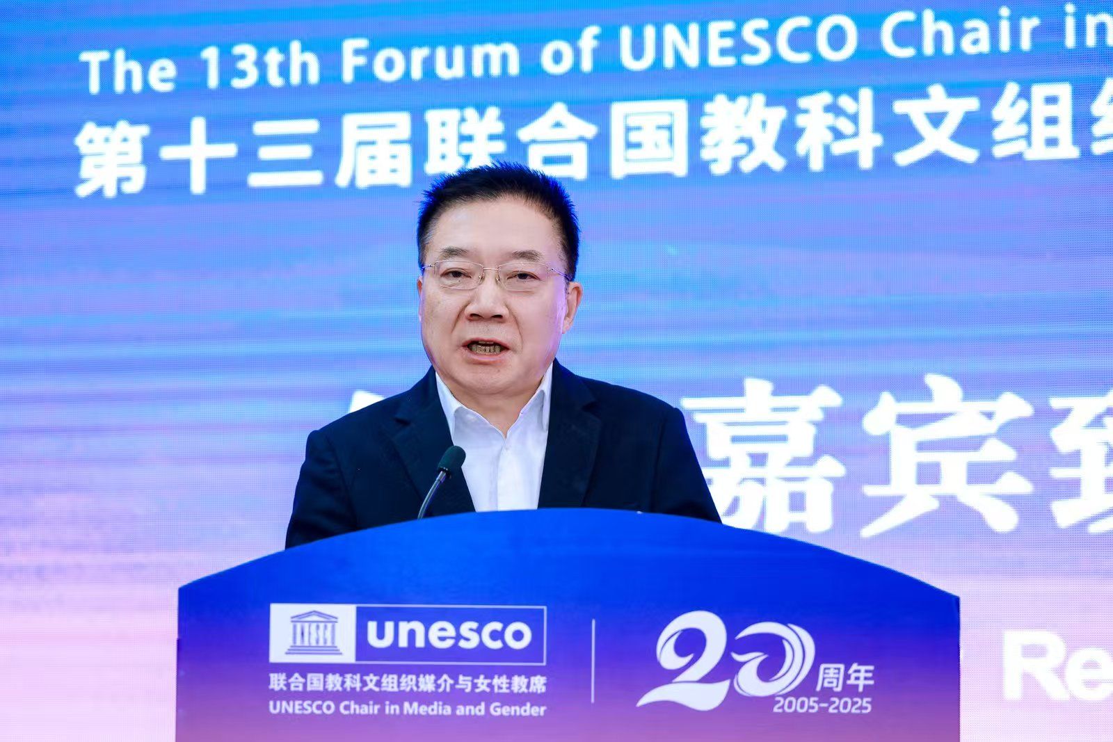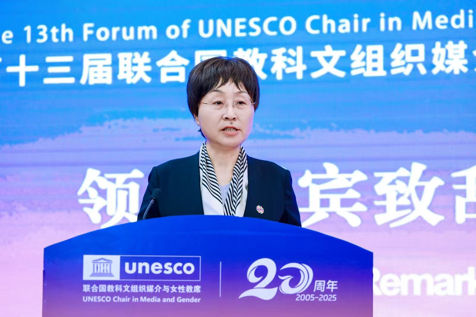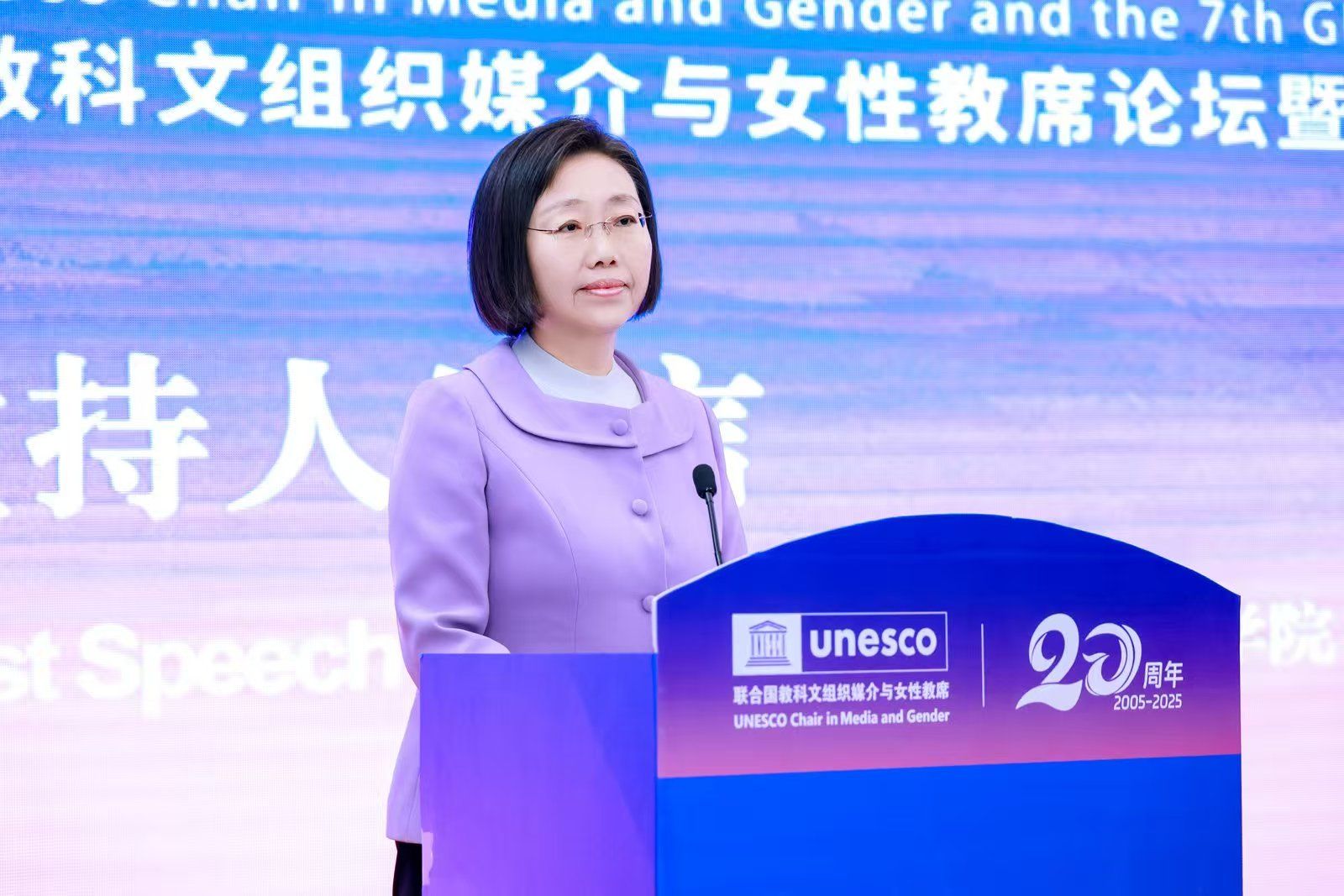 中国常驻联合国教科文组织代表团大使衔代表杨新育在致辞中向教席成立二十周年表示祝贺。她指出,教席成立以来,在推动性别平等和妇女赋能方面取得了卓越成就。此次论坛以“推动女性在AI时代的全面发展”为主题,顺应数字技术浪潮,为女性赋能,促进科技创新和社会治理中女性的广泛参与。她希望,联合国教科文组织媒介与女性教席不负使命,继续以知识启迪智慧,以教育赋能未来,努力推动性别平等与人类文明进步的征程。