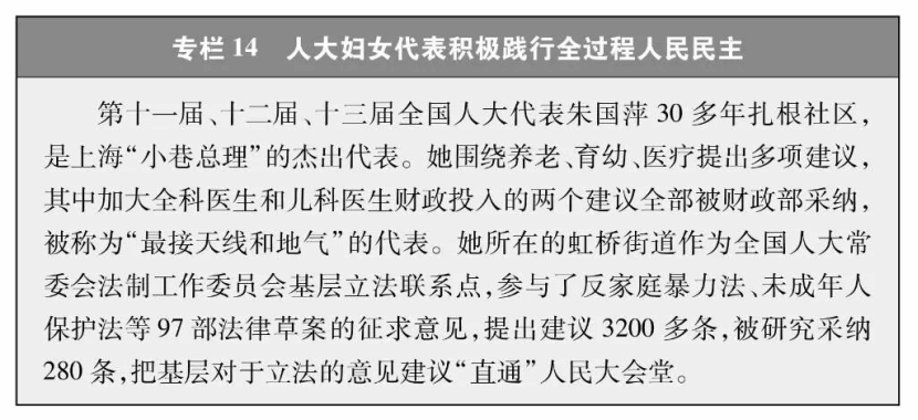 通过人民代表大会行使国家权力。人大代表中妇女代表比例不断提升。2023年第十四届全国人大妇女代表790人,占26.5%,比第十二届、十三届分别提高3.1个、1.6个百分点;全国县、乡两级人大妇女代表比例分别为31.64%、32.36%。人大妇女代表依法履职尽责,听取和反映妇女群众和各方意见建议。2018-2025年,全国人大妇女代表提出建议、批评和意见共29328件,占建议总数的42.3%。