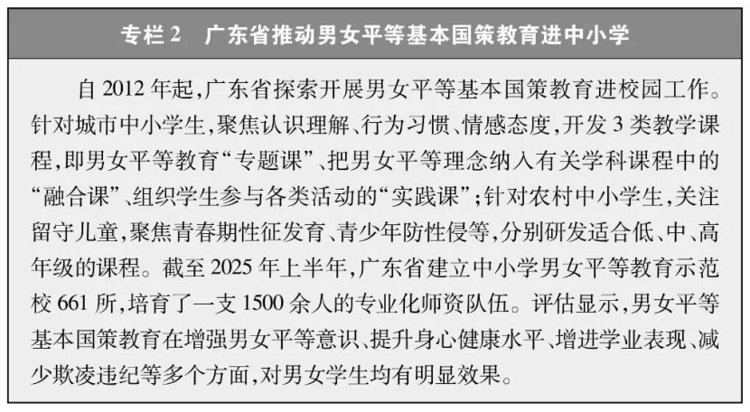 大力宣传男女平等基本国策。开展全方位、多渠道、分众化宣传教育,推进男女平等基本国策进机关、学校、企业、城乡社区、家庭等。面向党政领导干部,组织编写《男女平等基本国策的贯彻与落实》读本,将有关内容纳入党校课程体系和教学计划。面向学生群体,积极推进大中小学男女平等教育,在教材规划、教材管理办法及相关课程教材指南中纳入男女平等内容,教材配图人物注重性别比例均衡,选文案例注重选取优秀女作家作品,破除性别刻板印象。面向社会公众,把男女平等基本国策纳入城乡社区精神文明建设,纳入村规民约、居民公约,纳入家庭家教家风建设。党员干部、专家学者、妇女工作者共同开展宣讲,通过喜闻乐见的宣传教育活动,让公民了解国策、践行国策。
