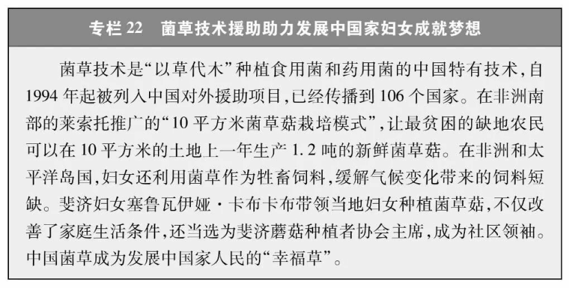 助力“南南合作”妇女减贫和发展。支持发展中国家改善妇女生存发展环境,实施100个“妇幼健康工程”、100个“快乐校园工程”,推出住房、乡村道路及技能培训等赋能妇女和女童的“小而美”民生项目。利用全球发展和南南合作基金,在20余个国家实施超4000万美元的妇女领域项目。澜湄合作专项基金投入1200万元,支持实施妇女发展项目。菌草技术通过援外培训和技术援助等方式,帮助106个国家妇女就业。