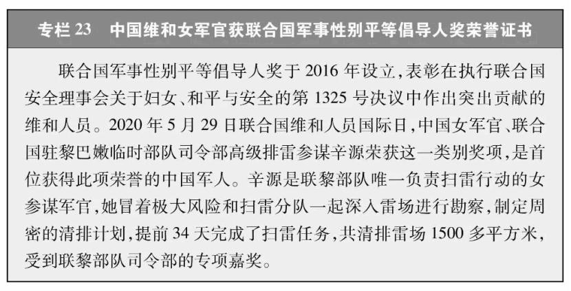 支持妇女参与维护和平与安全。以实际行动落实联合国安理会“关于妇女、和平与安全”决议,支持妇女在预防冲突、和平谈判和家园重建过程中发挥重要作用。2022年,中国-联合国和平与发展基金发起高级女性人才培训项目,促进联合国维和行动中高级别岗位性别平等。中国有维和女官兵1200余名、维和女警100余人次参与医疗保障、联络协调、扫雷排爆、巡逻观察和促进性别平等、妇女保护等工作。