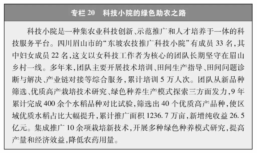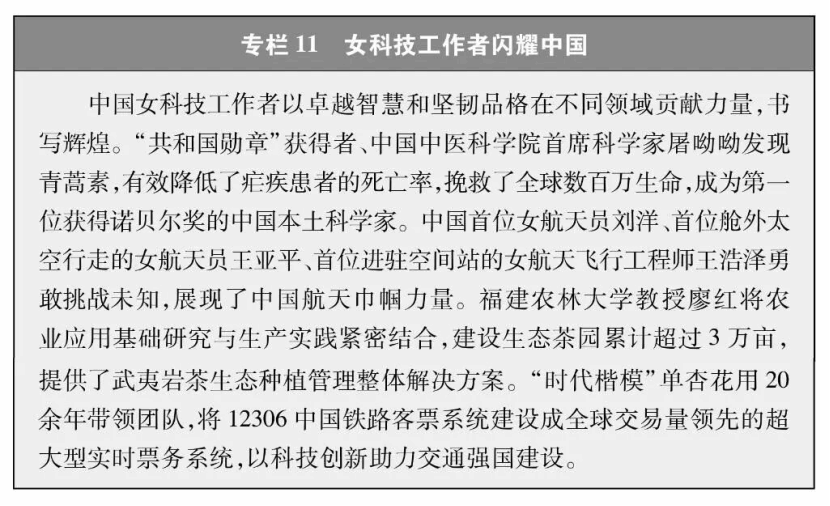 妇女科学素质逐步提升。颁布《全民科学素质行动规划纲要(2021-2035年)》,将提升妇女科学素质纳入其中。印发《中小学科学教育工作指南》,优化中小学课程教材、实验教学、师资培养、实践活动,加强科学教育资源对接转化。实施“科学有她——女生爱科学”“科技赋能女童”“春蕾科技女孩”“探知未来科技女性培养计划”“女性科学家成长计划”等公益项目,激发和培养女学生科学兴趣。实施女职工素质提升工程,帮助女职工提升数字技能。科学素质性别差距持续缩小,女性科技人才队伍规模逐步扩大、结构不断优化、能力显著提升,在基础理论、应用技术、工程实践等各个方面作出了杰出贡献。2024年,研究与试验发展(R&D)人员中妇女达284.6万,比2012年增加169.2万。