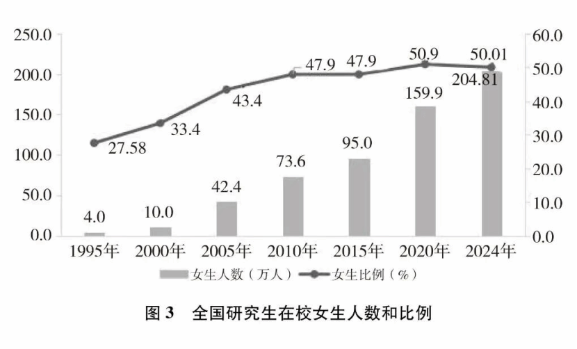 高等教育男女比例基本均衡。持续推进建设全球规模最大的高等教育体系,巩固提升高等教育普及化水平,以政策规定保障普通高等学校招生性别公平。2024年高等教育在校生中女生占50.76%,比1995年提高14.15个百分点。其中,女研究生占50.01%,比1995年提高22.43个百分点。
