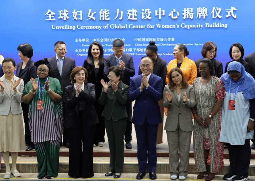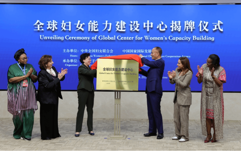 全国妇联党组书记、副主席、书记处第一书记黄晓薇(左三)与国家国际发展合作署党组书记、署长陈晓东(右三)为全球妇女能力建设中心揭牌。中国日报记者 王壮飞 摄