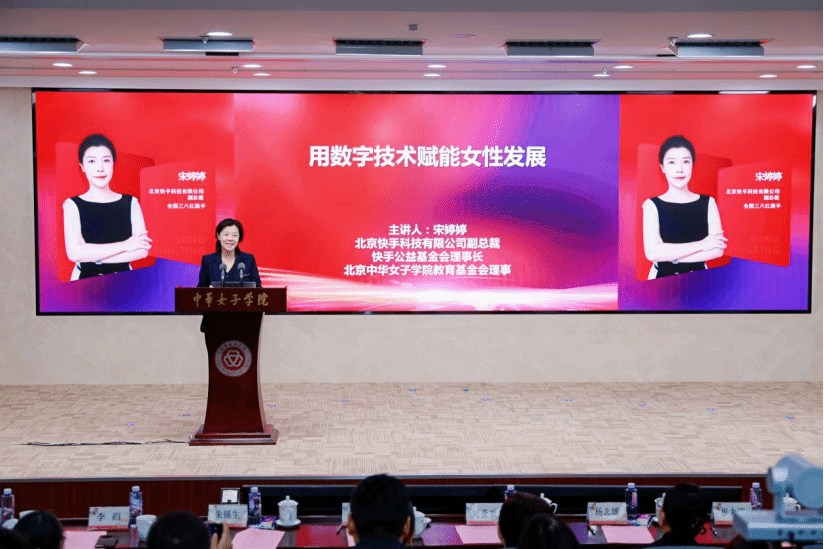 宋婷婷理事结合个人成长与企业实践,以“用数字技术赋能女性发展”为题,介绍了快手在多领域的公益实践,阐述了数字平台为女性发展带来的机遇,鼓励青年女性珍惜时代机遇,积极融入数字浪潮。