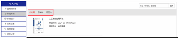 4、我的荐购:【个人中心】→【我的荐购】 中可查看到所有的荐购书目,及图书馆的采纳情况。