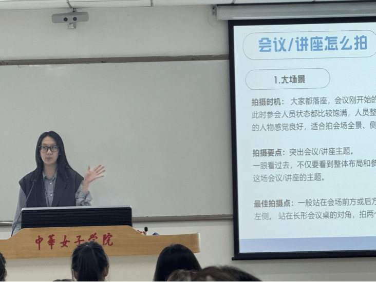 学生会网宣部部长林可围绕“拍摄工作”进行教学,从相机基础操作、手机拍摄技巧,到活动摄影的构图原则、关键瞬间捕捉(如活动开场、互动环节、合影时刻),通过现场演示与案例对比,让新干事快速理解不同场景下的拍摄重点。