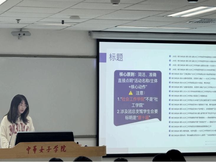 团总支办公室部长王雅娴则针对“推文简讯类撰写”展开指导,从传递信息更有效、塑造学院好形象和凝聚同学更有力三点解释了为什么要做好推文,并且详细为大家讲解了写好推文的四个步骤,同时结合多篇优秀推文案例分析常见问题,助力新干事掌握信息传递的关键能力。