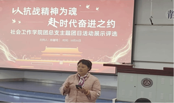 社会工作学院党总支书记巫晓莲老师对活动进行点评总结,对参评的各个团支部的成果展示给予了高度肯定,鼓励每一位团员青年要铭记历史、践行抗战精神,做一名责任感强、敢于担当的新时代青年。