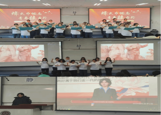 展示评比现场,各班团支部用创意与行动汇报了形式新颖多样、内容丰富多彩的团日活动,成果精彩呈现:2025级社会工作妇女服务团支部全体同学进行了《烽火巾帼志,青春接力行》主题诗朗诵,2024级社会工作2班团支部带来《红烛照血,青史承魂》主题集体朗诵,2024级社会学1班团支部推出《数字人穿越对话》创意展示,23级、24级的团支部通过主题宣讲、特色作品展演等方式,生动诠释抗战精神内涵,充分展现支部协作力与青年创意。