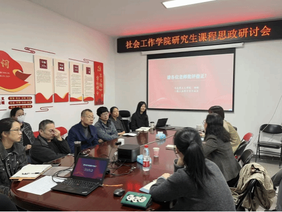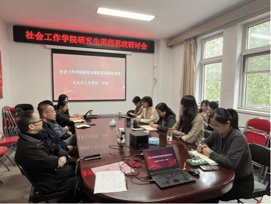 2025年10月15日下午,社会工作学院在主楼344会议室召开研究生课程思政研讨会。学院院长李敏教授、研究生课程负责人和任课教师参加会议,马克思主义学院刘旸副教授参会指导,共同探讨社会工作专业课程思政的理论内涵与实践路径。会议由学院分管研究生工作副院长郝彩虹主持。