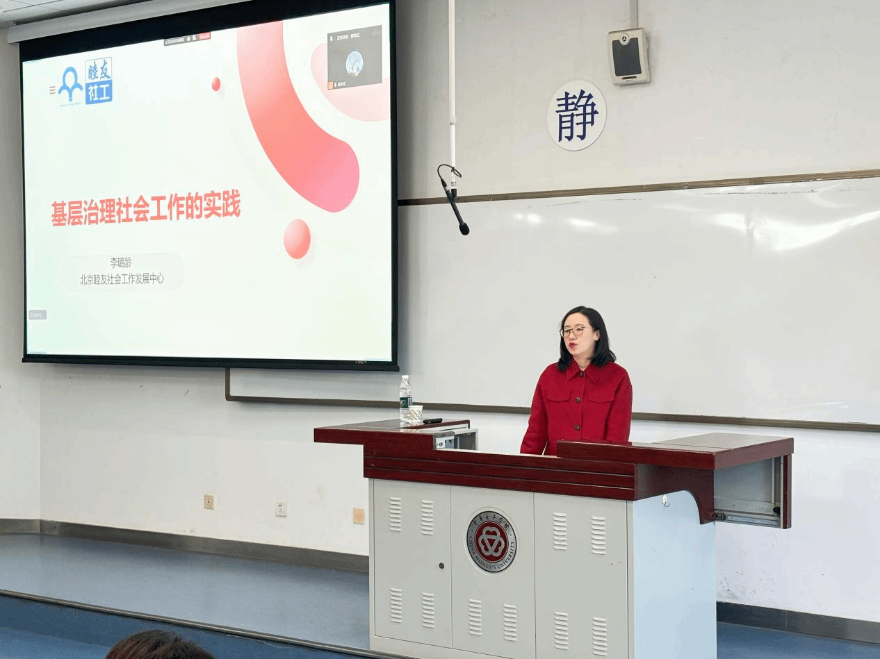 讲座第一部分,李老师以“党建引领基层政权建设”为主题,阐述了党建在基层治理中的核心作用。她指出,基层治理是国家治理体系的重要环节,治理的关键在于平衡“活力”与“秩序”,社会工作者在其中发挥专业作用,通过介入与赋能推动社区更加和谐有序。随后,李老师介绍了社区基层治理的结构与主要实务内容,并结合案例帮助同学们深入理解党建引领下的基层治理实践。