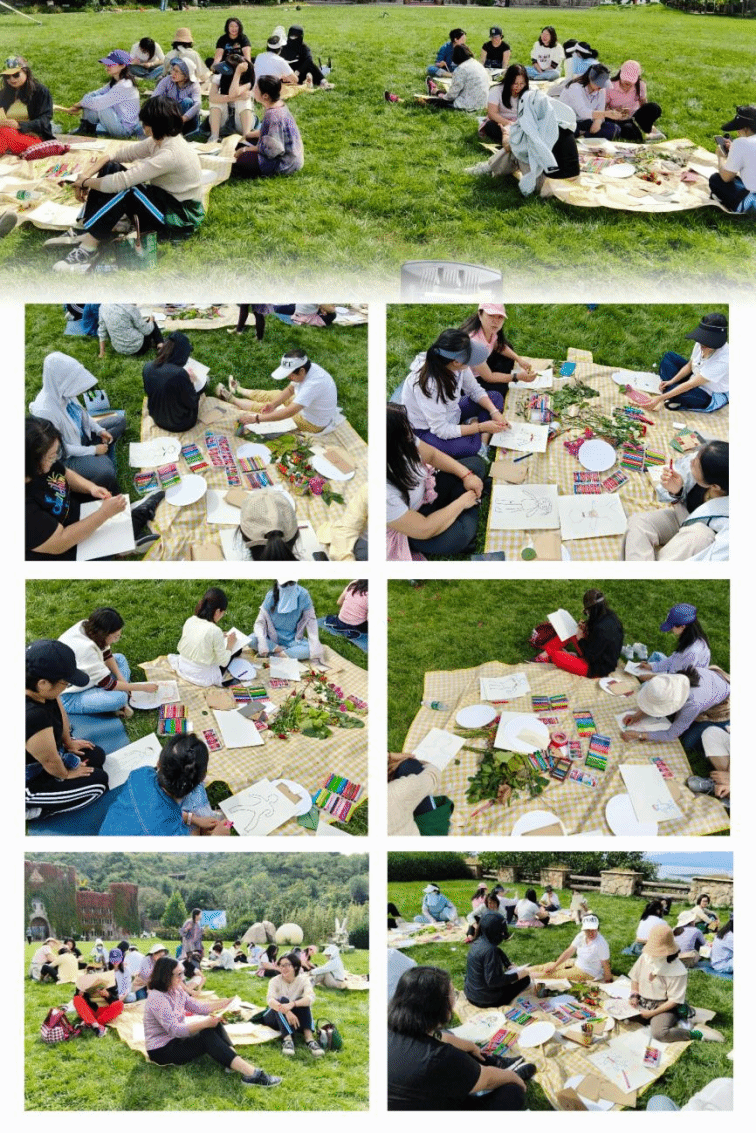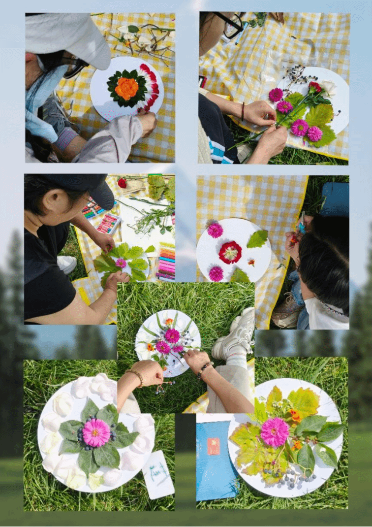 在花草曼陀罗创作环节,心理指导老师现场准备了鲜花、树叶、枝条与画纸,大家自由分组选择素材进行创作:有的将花瓣拼成圆满的花环,表达安宁与和谐;有的用叶片与花朵勾勒出心境的变化,寄托“初心”“回归”“平和”等心愿。草坪上铺展的作品色彩缤纷,既展现了个人的独特表达,也构成了一幅充满生命力的集体画卷。在创作的过程中,大家逐渐进入平静而专注的心理状态。